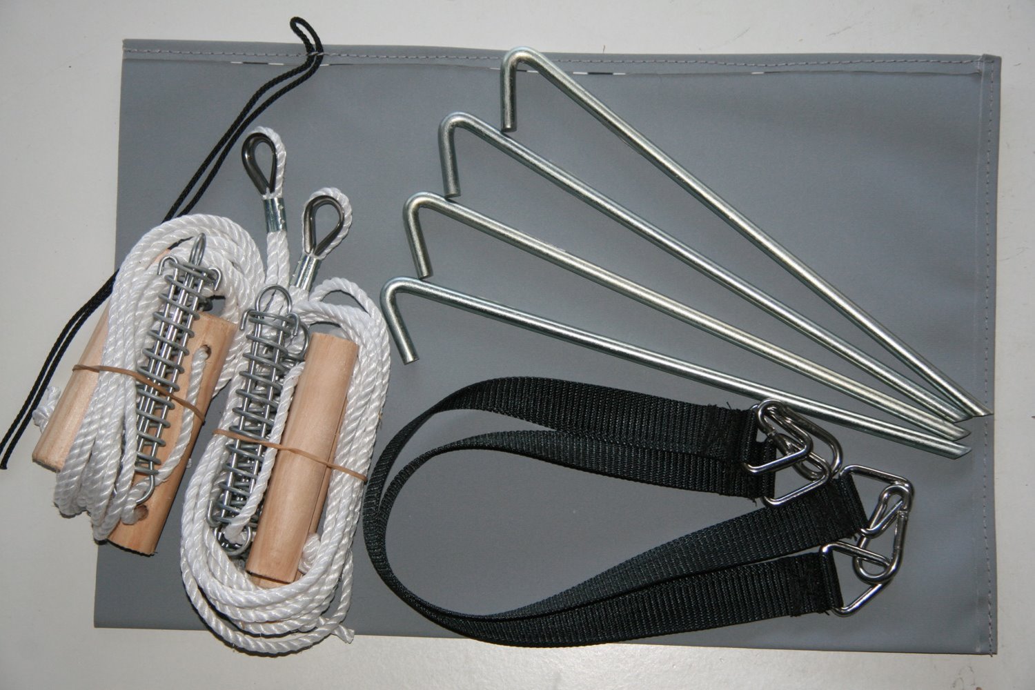 Includes 1 pair of straps with stainless steel fittings, 2 double ropes with s. steel ring, 4 big pegs in a canvas bag